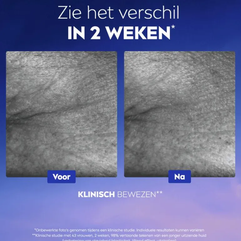 - Zichtbare verbeteringen zijn te zien vanaf 2 weken*. Regelmatig gebruik leidt tot nog betere resultaten in de loop van de tijd. 100% merkt een jonger uitziende vanaf 4 weken**.