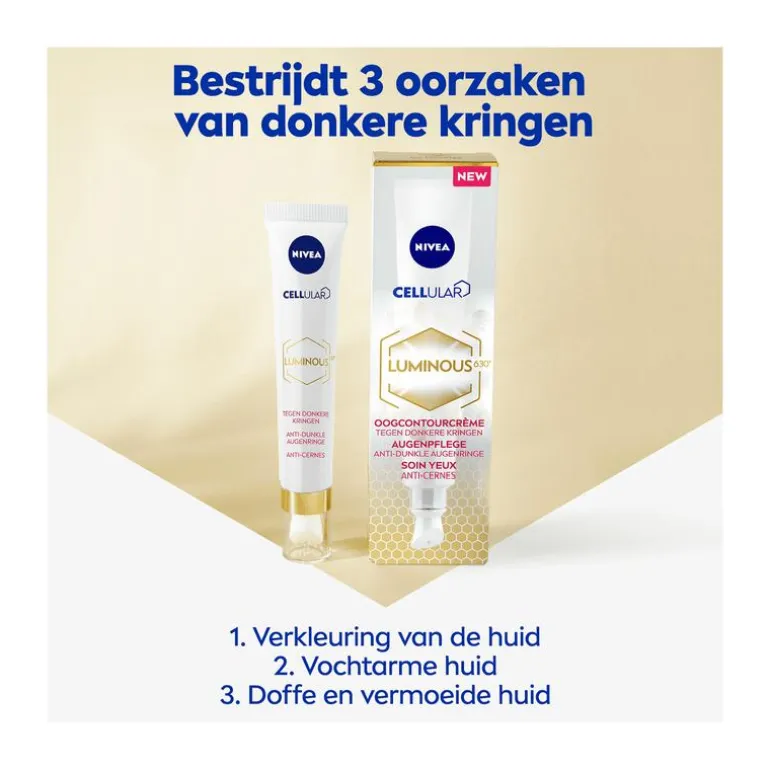 Ontdek de ultieme verzorging tegen donkere kringen en wallen met NIVEA CELLular LUMINOUS630 Oogcontourcrème. Deze effectieve oogcrème verzorgt de gevoelige huid rond de ogen en gaat de strijd aan tegen wallen en donkere kringen. Geniet van een verlichte en jeugdig ogende oogcontour, met zichtbaar minder donkere kringen onder de ogen binnen 4 weken*. Deze NIVEA oogcrème is het baanbrekende resultaat na 10 jaar nauwgezet onderzoek en het screenen van 50.000 ingrediënten. Dit zorgde voor de ontdekking van LUMINOUS630, een stof die pigmentatie op cellulair niveau in evenwicht brengt. De NIVEA CELLular LUMINOUS630 Oogcontourcrème, met LUMINOUS630, balanceert de pigmentatie en verlicht donkere kringen, terwijl cafeïne wallen vermindert. Het hyaluronzuur hydrateert en verstevigt de huid, waardoor fijne lijntjes en rimpels verminderen. Gebruik samen met NIVEA Anti-spot Luminous serum voor optimale resultaten. *Product gebruikstest, 41 vrouwen, 12 weken. • Maakt wallen zichtbaar kleiner • Verlicht en verkwikt donkere kringen onder de ogen • Verjongt de oogcontour en vermindert rimpels en fijne lijntjes • Hydrateert en verzorgt de kwetsbare huid onder de ogen • Geschikt voor alle huidtypen