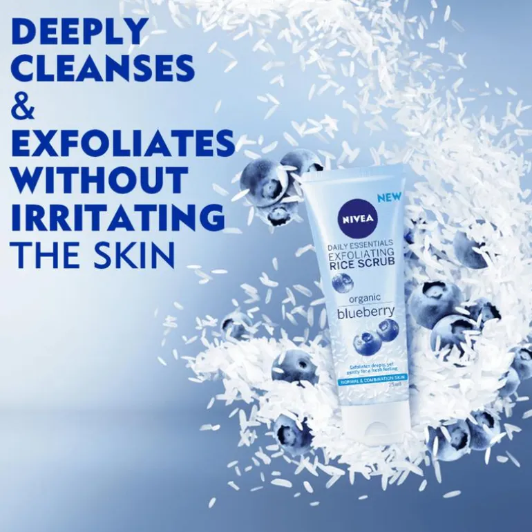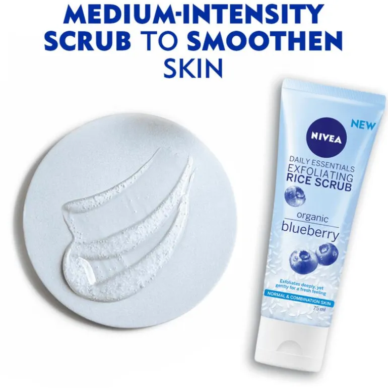 Verzacht de huid met een 100% natuurlijke scrub. NIVEA Egaliserende Bio Rijst Scrub is een medium-intensieve scrub die perfect past bij de normale huid. De milde bestanddelen in de NIVEA Egaliserende Bio Rijst Scrub exfoliëren de huid, waarbij ze effectief dode huidcellen verwijderen. Tegelijkertijd werkt het product ook als intensieve gezichtsreiniging die het ontstaan van onzuiverheden helpt tegengaan. Dit allemaal op een bijzonder milde manier, zonder je huid te irriteren. Geniet van een verfijnd huidoppervlak en een fris aanvoelende huid.De NIVEA scrub bevat hoogwaardige Japonica-rijstzaden, die verbrijzeld en gezeefd worden en vervolgens gemengd worden met bosbessensap. De rijstdeeltjes hebben een exfoliërende werking en bieden tegelijkertijd verzachting en diepe hydratatie. Blauwe bessen, rijk aan antioxidanten, beschermen de huidcellen tegen schade. Dit zorgt voor een opfrissende, verzachtende en beschermende werking, ideaal voor de onzuivere huid. • Reinigt de huid grondig en verwijdert dode huidcellen• Is bijzonder mild en heeft een verzachtende werking• Verfijnt en versterkt het huidoppervlak, voor een frisse huid• Irriteert de huid niet• Helpt de natuurlijke vochtbalans van de huid te behouden
