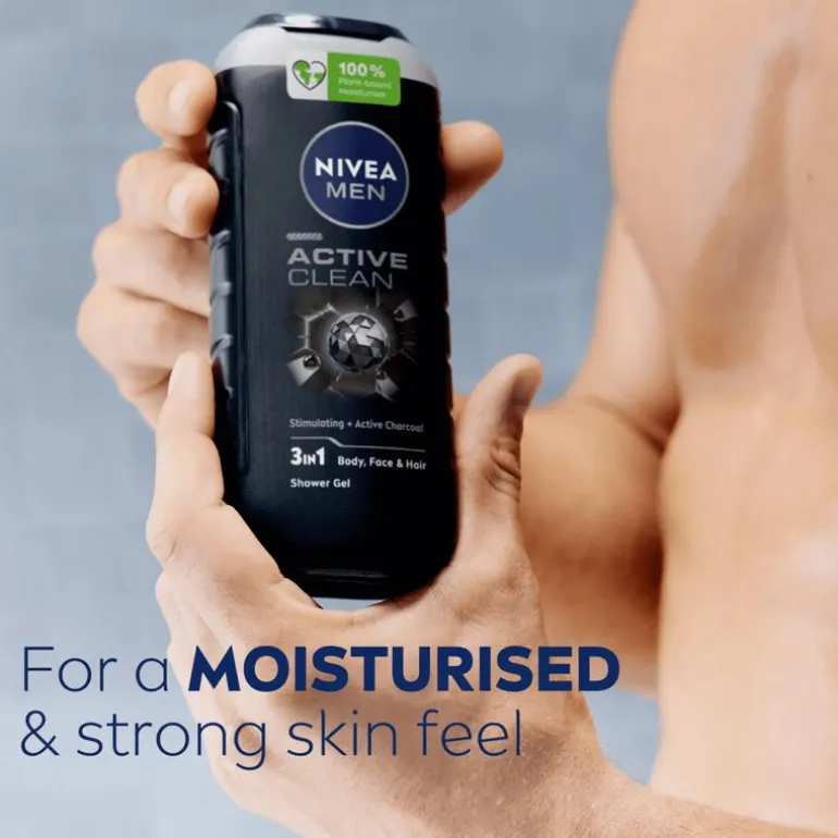 NIVEA MEN Active Clean Douchegel 250ml is een krachtige 3-in-1 reiniging voor lichaam, gezicht en haar. De formule is verrijkt met geactiveerde houtskool van natuurlijke oorsprong, die werkt als een vuilmagneet: het verwijdert grondig vuil, talg en onzuiverheden zonder de huid uit te drogen. Deze douchegel is pH-huidneutraal en dermatologisch goedgekeurd, waardoor het geschikt is voor dagelijks gebruik. De formule is voor 99% biologisch afbreekbaar* en wordt geleverd in een fles gemaakt van 97% gerecycled plastic**. Geniet van een diep gereinigde, fris aanvoelende huid met respect voor zowel je lichaam als het milieu. *Volgens OESO-methoden. **Labels uitgezonderd.