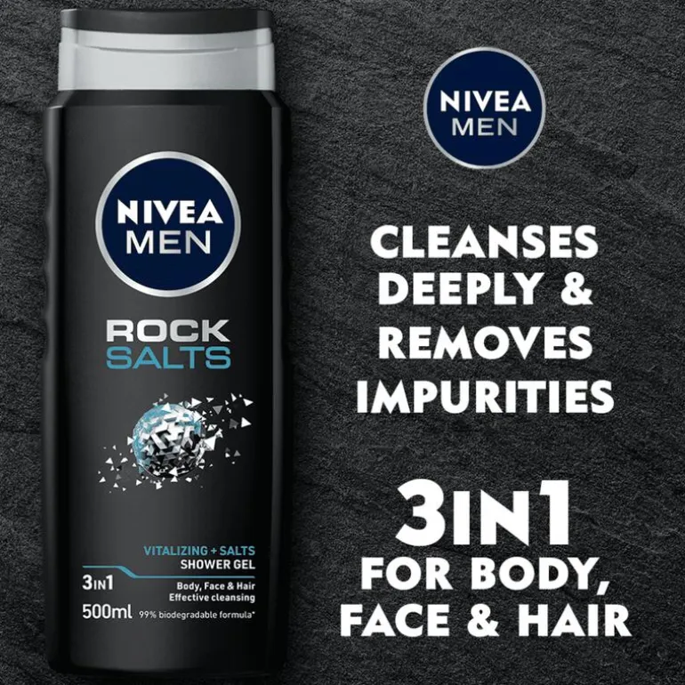 Dankzij de veelzijdige werking is deze douchegel een perfecte keuze voor mannen die zowel hun huid als hun haar in één stap willen verzorgen. Voeg NIVEA MEN Rock Salts toe aan je dagelijkse routine voor een effectieve en verfrissende ervaring, elke keer weer.