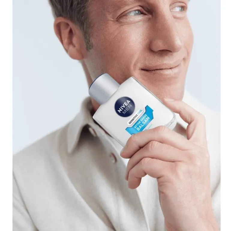 NIVEA MEN Sensitive Cooling Aftershave Balsem verzacht direct na het scheren. Deze aftershave verkoelt irritaties zonder een branderig gevoel achter te laten en biedt een langdurig mild en comfortabel gevoel op de huid. De alcoholvrije* formule met kamille en hydraterend zeewierextract brandt niet en verzacht de huid. Geen ontsierende roodheid en andere irritaties dus, en precies wat je zoekt voor een zelfverzekerd gevoel.