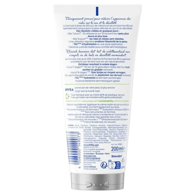 Verzorg je hals en decolleté doelgericht met de NIVEA Q10 Anti-Rimpel Hals & Decolleté Crème 200ml. Deze rijke body care crème is speciaal ontwikkeld om de zichtbaarheid van rimpels te verminderen en de huid te verstevigen. Dankzij de krachtige combinatie van Q10, Creatine en Provitamine B5 wordt de huid intensief gevoed en langdurig gehydrateerd tot wel 72 uur*. Bij regelmatig gebruik voelt de huid al na 7 dagen* gladder en zachter aan, en worden fijne lijntjes en rimpels na 14 dagen** zichtbaar verminderd. De crème ondersteunt de huidelasticiteit, speciaal op kwetsbare zones zoals de hals en het decolleté. De formule trekt snel in zonder plakkerig gevoel en maakt je huid zichtbaar soepeler en steviger. Geef je huid de verzorging die ze verdient met de verstevigende anti-rimpel crème van NIVEA Q10 – voor een gladder, jeugdiger uitziend huidoppervlak.