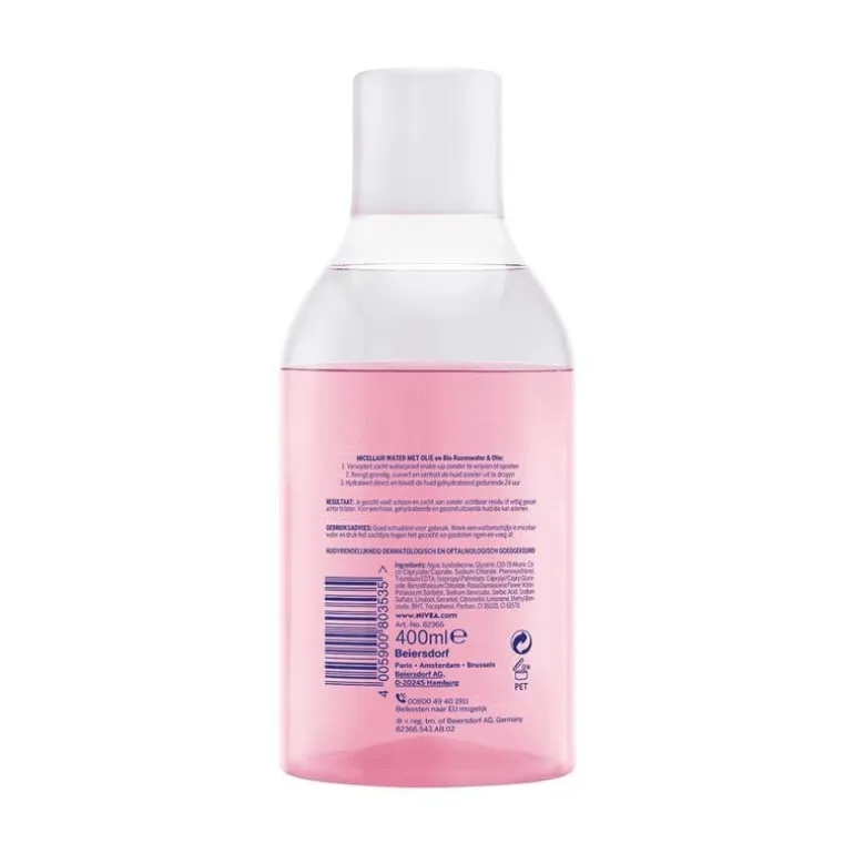 NIVEA Micellair Rose Water 400ml is verrijkt met Bio Rozenwater en verwijdert waterproof make-up zonder hard te wrijven. De formule reinigt grondig, zuivert en verfrist de huid zonder uit te drogen. De Reinigingsgel hydrateert direct en houdt de huid gehydrateerd gedurende 24 uur. Je gezicht voelt schoon en zacht aan zonder zichtbaar residu of vettig gevoel achter te laten. Voor een frisse, gehydrateerde en gezond uitziende huid die kan ademen. NIVEA Micellair Rose Water is huidvriendelijkheid dermatologisch goedgekeurd.