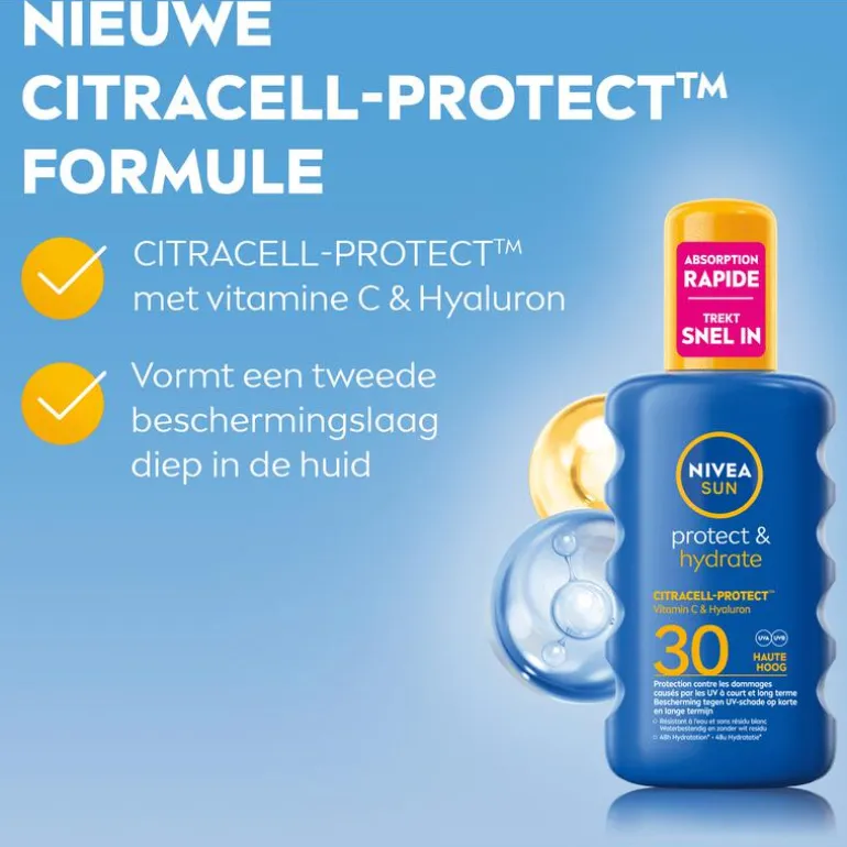 Geef je huid de bescherming die het verdient met de NIVEA SUN Protect & Hydrate Spray SPF30. Deze zonnespray biedt betrouwbare UVA/UVB-bescherming en beschermt je huid tegen UV-schade op korte en lange termijn. Dankzij de innovatieve CitraCell-ProtectTM-formule met vitamine C en hyaluron wordt een extra beschermingslaag gecreëerd die je huid niet alleen beschermt, maar ook hydrateert. De lichte formule trekt snel in, is eenvoudig aan te brengen en laat geen vettig gevoel of wit residu achter.Met een hydraterende werking die tot 48 uur* aanhoudt, zorgt deze zonnebrand spray ervoor dat je huid zacht en gezond aanvoelt, zelfs tijdens intensieve blootstelling aan de zon. Of je nu op zoek bent naar een effectieve zonnebrandcrème gezicht, een handige zonnebrand spray voor onderweg, of een betrouwbare keuze voor de hele familie, deze zonnespray voldoet aan al je verwachtingen.Perfect te combineren met je favoriete aftersun voor een complete zonverzorgingsroutine. *Instrumentele test, 43 vrijwilligers
