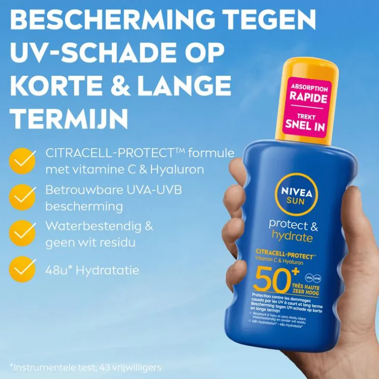 Geef je huid de bescherming die het verdient met de NIVEA SUN Protect & Hydrate Spray SPF50+. Deze zonnespray biedt betrouwbare UVA/UVB-bescherming en beschermt je huid tegen UV-schade op korte en lange termijn. Dankzij de innovatieve CitraCell-ProtectTM-formule met vitamine C en hyaluron wordt een extra beschermingslaag gecreëerd die je huid niet alleen beschermt, maar ook hydrateert. De lichte formule trekt snel in, is eenvoudig aan te brengen en laat geen vettig gevoel of wit residu achter.Met een hydraterende werking die tot 48 uur* aanhoudt, zorgt deze zonnebrand spray ervoor dat je huid zacht en gezond aanvoelt, zelfs tijdens intensieve blootstelling aan de zon. Of je nu op zoek bent naar een effectieve zonnebrandcrème gezicht, een handige zonnebrand spray voor onderweg, of een betrouwbare keuze voor de hele familie, deze zonnespray voldoet aan al je verwachtingen.Perfect te combineren met je favoriete aftersun voor een complete zonverzorgingsroutine. *Instrumentele test, 43 vrijwilligers
