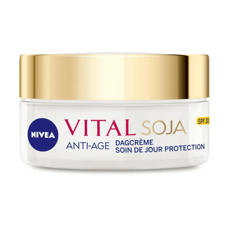 Begin je dag goed met NIVEA VITAL Soja Anti-Age Verstevigende Dagcrème. Deze dagcrème is speciaal ontwikkeld voor de rijpe huid met huidverkleuringen. Door de celvernieuwing te stimuleren, worden pigmentvlekken minder zichtbaar en verminderen rimpels en fijne lijntjes. De huid is beter in staat om vocht vast te houden, wat voor een zacht en veerkrachtig gelaat zorgt. Dankzij de toevoeging van SPF 30 bescherm je je huid effectief tegen uv A/uv B. Zo vermindert de dagcrème met SPF 30 de kans op vroegtijdige huidveroudering en wordt ook de vorming van nieuwe pigmentvlekken voorkomen. NIVEA VITAL Soja Anti-Age Verstevigende Dagcrème stimuleert celvernieuwing en vochtretentie, vermindert rimpels en hydrateert de huid. Dagelijks aanbrengen op gereinigd gezicht, nek en decolleté. Vermijd contact met de ogen. • Vermindert rimpels en fijne lijntjes zichtbaar • Beschermt tegen pigmentvlekken • Helpt de huid om meer vocht vast te houden • Voor een stevigere, egale en zachte huid • Verrijkt met sojaextract