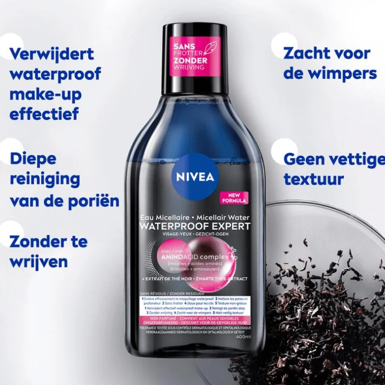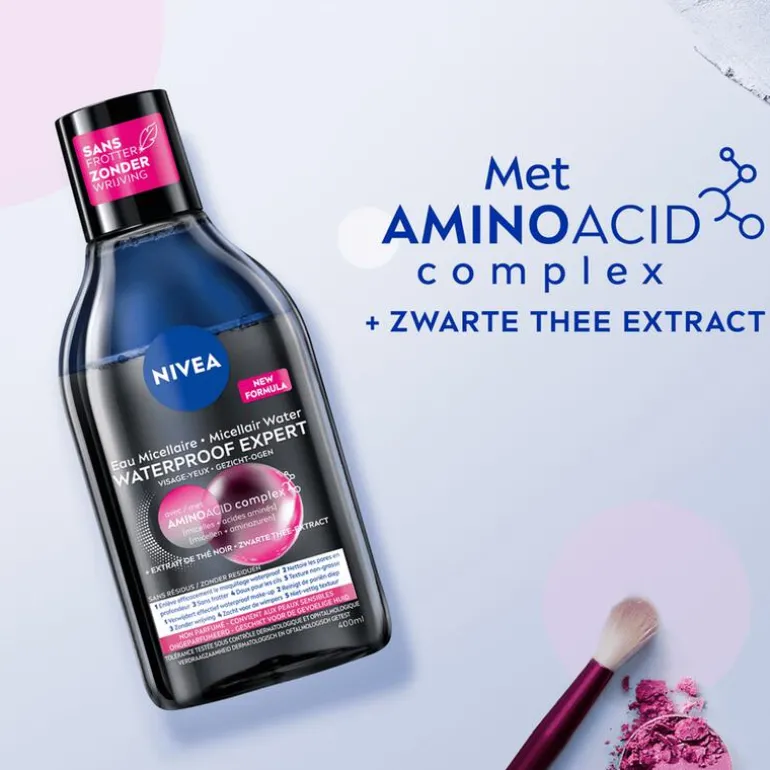 Reinig je huid als een professional met de NIVEA Micellair Water Waterproof Expert Make-up Remover. Deze krachtige make-up remover verwijdert langhoudende waterproof make-up en mascara zonder te wrijven. Het is zelfs niet nodig om het product af te spoelen, terwijl je wel met een frisse en verkwikte huid achterblijft. De effectieve formule geeft de huid een zuurstofboost en laat de huid ademen. De make-up remover is parfumvrij, verzorgt de wimpers en laat geen vettig laagje achter.De NIVEA Micellair Water Waterproof Expert Make-up Remover bevat micellair water, waarvan de micellen olie, vuil en make-up aantrekken voor een diepe reiniging. Zwarte thee biedt antioxidanten die huidveroudering tegengaan, terwijl glycerine en aminozuren zorgen voor intense hydratatie. Deze formule resulteert in een schone, beschermde en gehydrateerde huid, waardoor het product ideaal is voor dagelijks gebruik. De huidvriendelijkheid is dermatologisch en oftalmologisch goedgekeurd. • Verwijdert langhoudende en waterproof make-up• Geeft de huid een zuurstofboost en laat de huid ademen• Trekt vuil en onzuiverheden aan als een magneet• Hydrateert en voedt de huid• Laat de huid zacht en fris aanvoelen