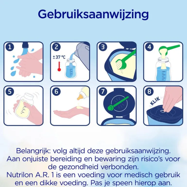 Nutrilon AR 1 is een dieetvoeding voor medisch gebruik bij spugen, geschikt voor baby’s van 0 tot 6 maanden oud. Borstvoeding is de beste voeding voor je baby. Gebruik Nutrilon AR 1 alleen onder medisch toezicht. Wil je Nutrilon AR 1 gebruiken? Overleg dan met je verloskundige, consultatiebureau of arts.
