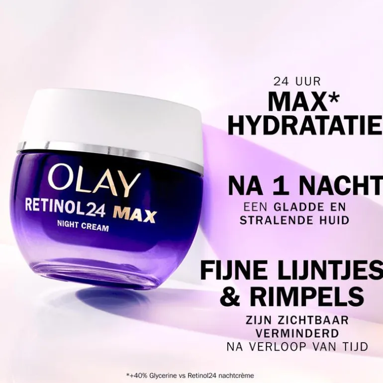 Vernieuw je huid met Olay Retinol 24 MAX hydraterende nachtcrème. De krachtige formule is ontworpen voor zichtbare resultaten: de formule MAX hydrateert onmiddellijk en gedurende 24 uur en na verloop van tijd zijn fijne lijntjes en rimpels zichtbaar verminderd. En dat is niet alles: je wordt al na 1 nacht wakker met een gladdere huid. De formule is vakkundig vervaardigd met een combinatie van retinylpropionaat, die tot 10 lagen diep doordringt in het huidoppervlak om de huidtextuur gladder te maken, en vitamine E, een bewezen antioxidant die schade door vrije radicalen bestrijdt en helpt om de huid er jonger uit te laten zien. Met +40%* glycerine, die de huid helpt vocht vast te houden waardoor ze gehydrateerd en zacht blijft.