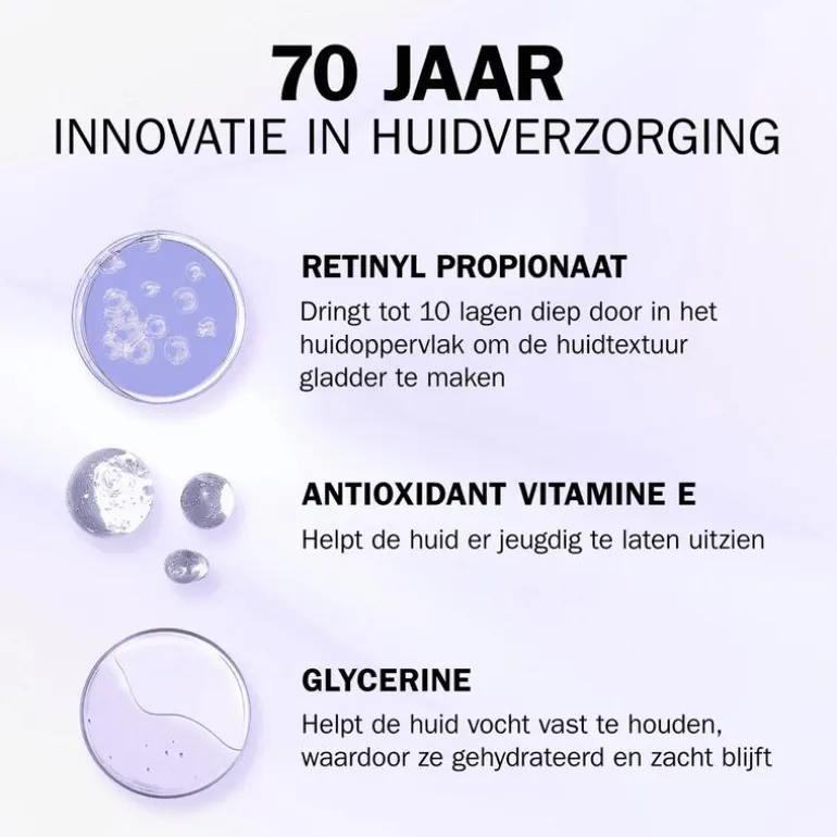 WAARSCHUWING: Contact met de ogen vermijden. Bij contact met de ogen, uitspoelen met water. Stop het gebruik indien irritatie van de huid of ogen optreedt. Aanbevolen voor gebruik met een hydraterende dagcrème met SPF. Bevat vitamine A. Denk vóór gebruik na over uw dagelijkse inname.