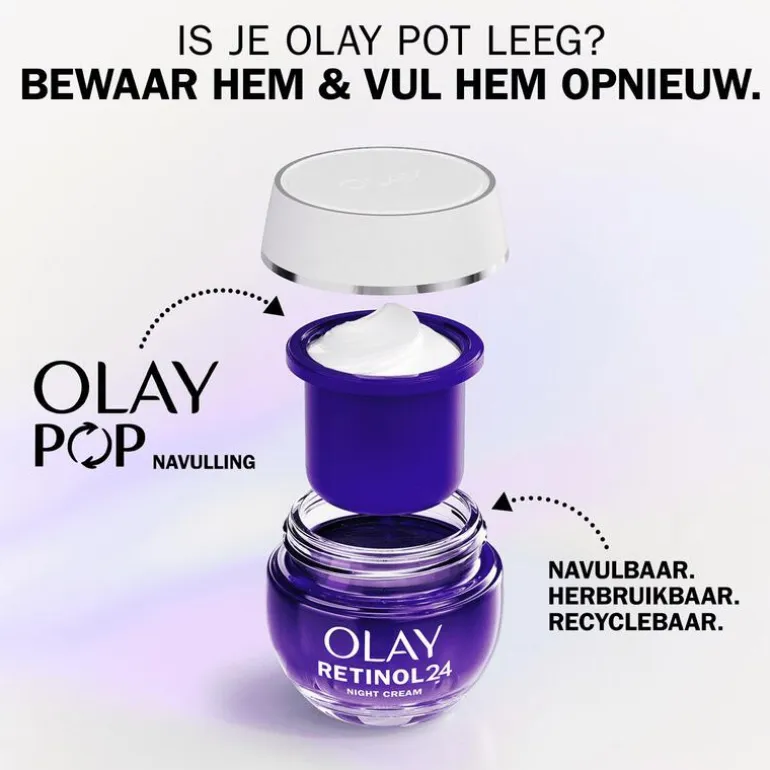 Is je glazen pot van Olay leeg? Gooi hem niet weg, maar vul hem met een Olay POP Retinol 24 navulling. Voeg deze navulling toe aan je hydraterende nachtcrème en vernieuw zichtbaar je huid. De krachtige formule is ontworpen voor zichtbare resultaten: ze hydrateert onmiddellijk en gedurende 24 uur en na verloop van tijd zijn fijne lijntjes en rimpels zichtbaar verminderd. En dat is niet alles: 96% van de gebruikers werd al na 1 nacht wakker met een gladdere huid. De formule is vakkundig vervaardigd met een combinatie van retinylpropionaat, die tot 10 lagen diep doordringt in het huidoppervlak om de huidtextuur gladder te maken, en vitamine E, een bewezen antioxidant die schade door vrije radicalen bestrijdt en helpt om de huid er jonger uit te laten zien.