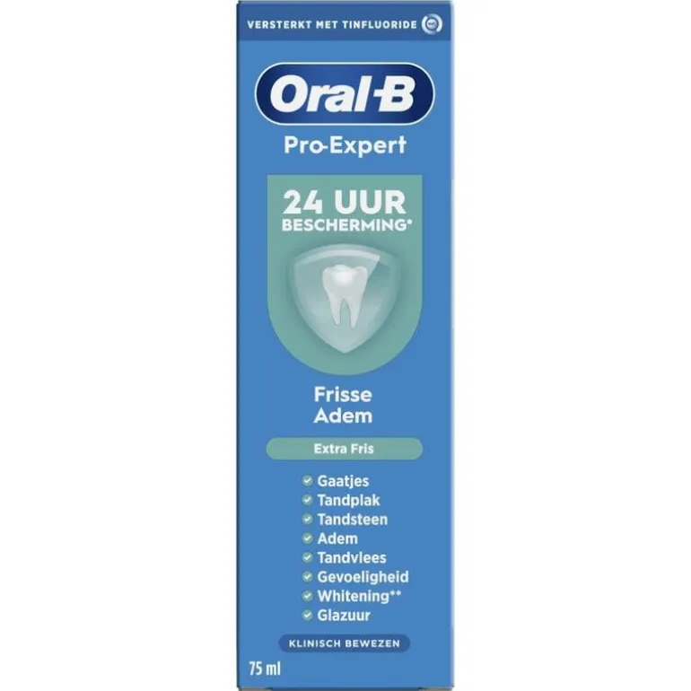 De Oral-B Pro-Expert Frisse Adem tandpasta is klinisch bewezen: hij biedt 24 uur bescherming bij twee keer per dag gebruik, de antibacteriële technologie met tinfluoride-complex creëert een beschermend schild om de groei van bacteriële tandplak te helpen verminderen, zelfs tussen de poetsbeurten door. De combinatie van pepermunt, groene munt, menthol, en een vleugje vanille, geeft een frisse explosie.
