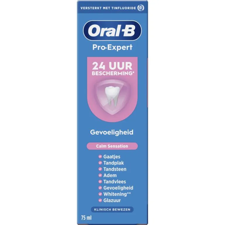 Oral-B Pro-Expert Gevoeligheid Calm Sensation tandpasta is klinisch bewezen: het biedt 24 uur bescherming bij twee keer per dag gebruik. De antibacteriële technologie met tinfluoride-complex creëert een beschermingsschild dat de groei van tandplak vermindert, zelfs tussen poetsbeurten door. De karakteristieke blend van pepermunt met eucalyptus geeft een koel gevoel in de mond.