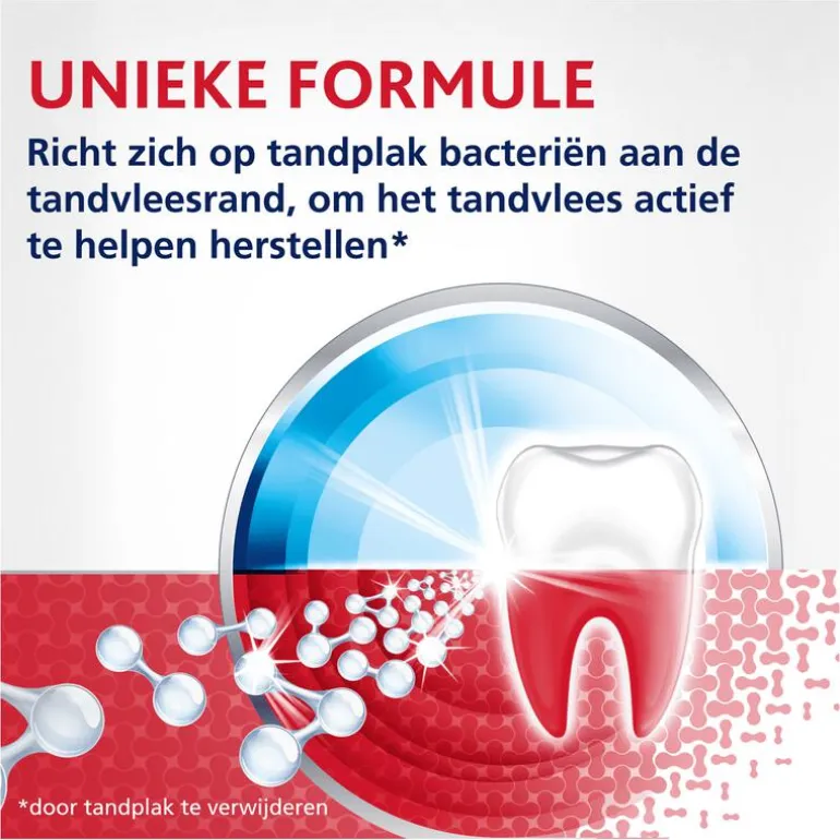parodontax Active Repair Tandvlees Fresh Mint tandpasta. Helpt vroege tekenen van bloedend tandvlees om te keren door de belangrijkste oorzaak, tandplak, aan te pakken. Het verwijdert actief tandplakbacteriën, waardoor tandvlees kan herstellen en een strakke afdichting rondom tanden kan vormen om bloedend tandvees te helpen stoppen. Voor gezond tandvlees en sterke tanden. Klinisch bewezen formule die tandplakbacteriën actief verwijdert om bloedend, gezwollen en ontstoken tandvlees te helpen herstellen.• Klinisch bewezen dat het bloedend, gezwollen en ontstoken tandvlees herstelt vanaf één week*.• Helpt vroege tekenen van bloedend tandvlees tegen te gaan door tandplakbacteriën actief te verwijderen.• Helpt het tandvlees om een goede aansluiting met de tanden te houden.• Speciaal geselecteerde ingrediënten om de smaak in balans te brengen, gecombineerd met verkoelende bestanddelen voor een frisse ervaring.Bij 2x daags poetsen.
