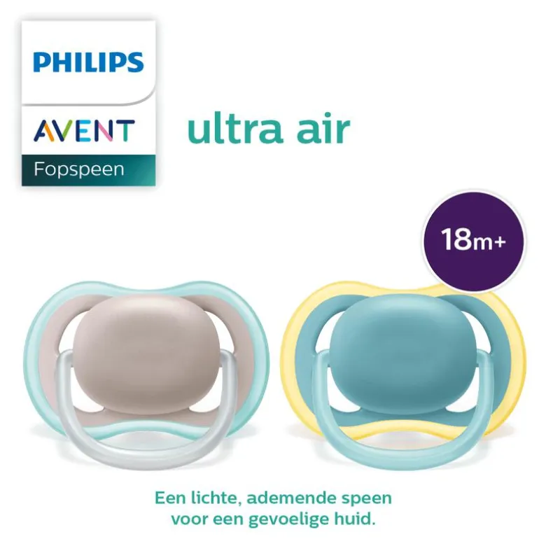 De Philips Avent ultra air fopspeen heeft extra grote luchtgaten om de huid van je baby droog te houden. De fopspeen van 100% siliconenmateriaal helpt bij de natuurlijke ontwikkeling van de mond en bootst het gevoel van de borst na. Verkrijgbaar in verschillende kleuren en maten. Vervang spenen elke 4 weken om hygiënische redenen.
