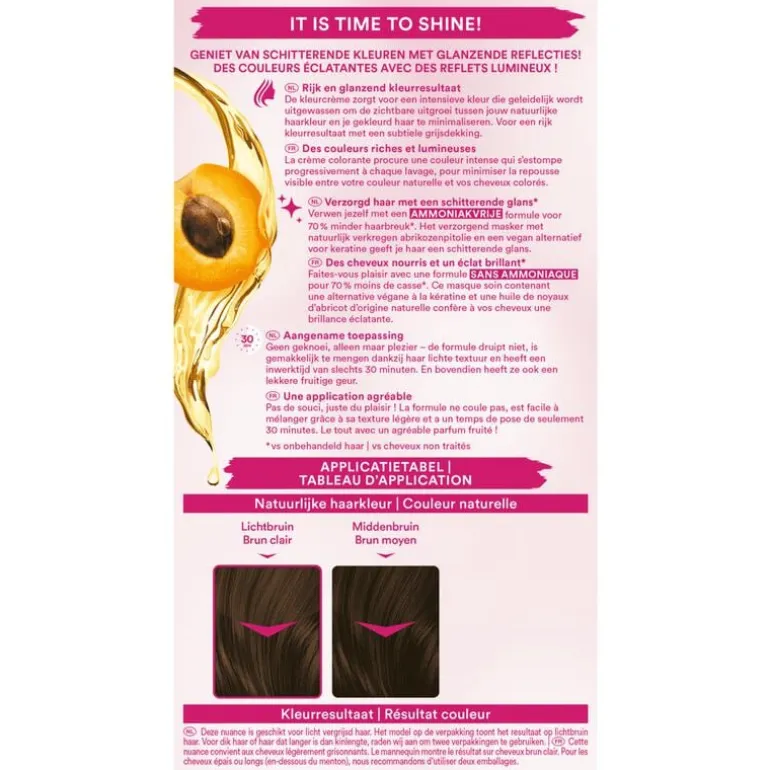 - Met hydraterend masker: na de haarkleuring voelt het haar diep gehydrateerd en zijdezacht aan. Het is makkelijk doorkambaar en heeft een onweerstaanbare glans.