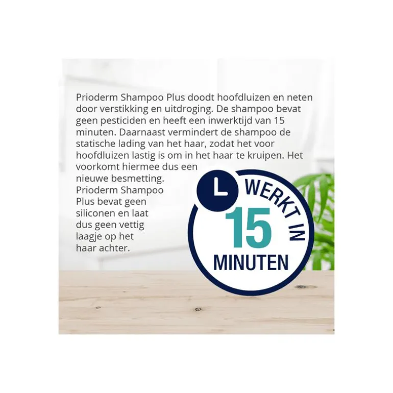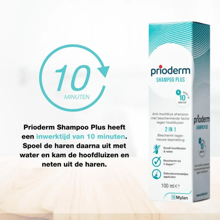 Prioderm Shampoo Plus is een anti-hoofdluis shampoo die hoofdluizen en neten doodt door verstikking en uitdroging. De shampoo bevat geen pesticiden en heeft een inwerktijd van 10 minuten. Daarnaast vermindert de shampoo de statische lading van het haar, zodat het voor hoofdluizen lastig is in het haar te kruipen. Het voorkomt hiermee dus een nieuwe besmetting. Prioderm Shampoo Plus bevat geen siliconen en laat dus geen vettig laagje op het haar achter.