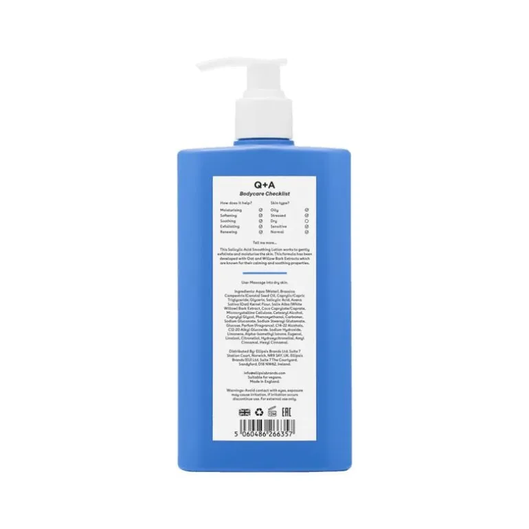 Deze Q+A lichtgewicht Salicylic acid smoothing body lotion is speciaal ontwikkeld voor de gestreste huid! Salicylzuur is een BHA die de huid exfolieert en puistjes aanpakt die ontstaan door de ophoping van dode huidcellen. Onze Salicylzuur Lotion is het perfecte product voor mensen die gevoelig zijn voor ‘backne’ en ongewenste huidtextuur.