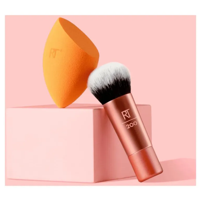 De spons heeft drie kanten: met de platte kant breng je de foundation aan, met de punt verberg je oneffenheden, en met de ronde kant blend je alles mooi in de huid. De kwast gebruik je om vloeibare of crème foundation gelijkmatig en naadloos aan te brengen voor een mooie, volle dekking.