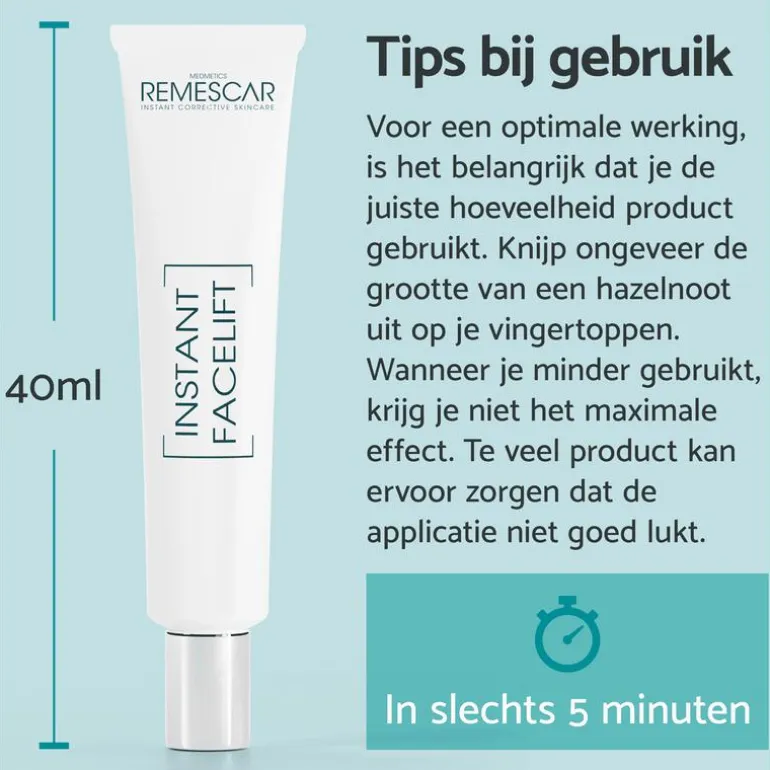 In combinatie met make-up: Breng Remescar Instant Facelift Cream aan op de te behandelen zones zoals hierboven aangegeven. Laat het product minimal 5 minuten drogen. Als je een wit residu ziet, heb je of te veel product of geen hydraterende crème gebruikt. Verwijder het witte residu met een beetje water. Nadat je Remescar Instant Facelift Cream hebt aangebracht kun je je make-up aanbrengen, maar vermijd make-up op oliebasis omdat dit de effectiviteit van Remescar Instant Facelift Cream kan verminderen.