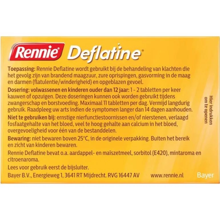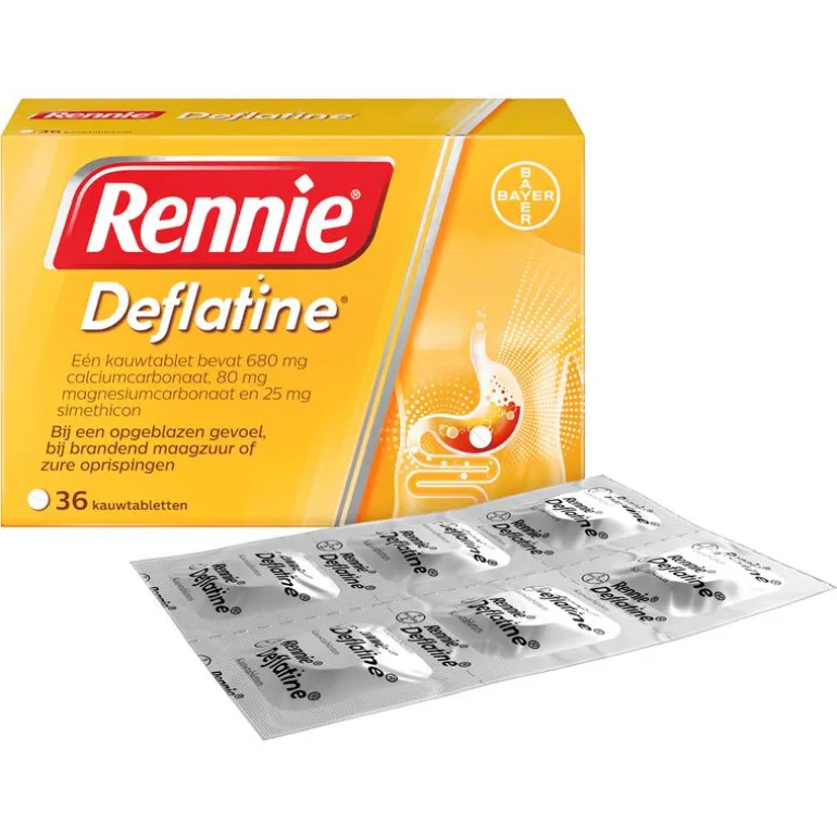 Rennie Deflatine bevat de werkzame stof simethicon, dat kleine gasbelletjes uit elkaar laat vallen in je maag en darmen. Hierdoor gaat het flatulentie tegen en neemt het gevoel van een opgeblazen buik af. Daarbovenop verlicht Rennie Deflatine ook brandend maagzuur binnen 2 minuten. Je maag is snel weer rustig zodat je weer van je dag of avond kunt genieten. Rennie is een maagzuurtablet en staat bekend als een maagzuurbinder. Dat betekent dat het overtollig maagzuur in je maag omzet in water en andere lichaamseigen stoffen. Zodra je last hebt van brandend maagzuur, eventueel samen met een opgeblazen buik of flatulentie, kun je 1 tot 2 kauwtabletten innemen.Rennie Deflatine is geschikt voor volwassenen en kinderen vanaf 12 jaar, maar kan ook door zwangere vrouwen gebruikt worden. Als je zwanger bent, raadpleeg dan wel je verloskundje of (huis)arts. Heb je geen last van winderigheid of een opgeblazen gevoel, dan kun je ook een gewone Rennie proberen, zoals de Suikervrije variant. Voor een dubbele werking is er Rennie Duo, die brandend maagzuur neutraliseert maar ook een beschermend laagje om de maaginhoud legt. Daardoor is de kans kleiner dat brandend maagzuur opnieuw in de slokdarm terecht komt.