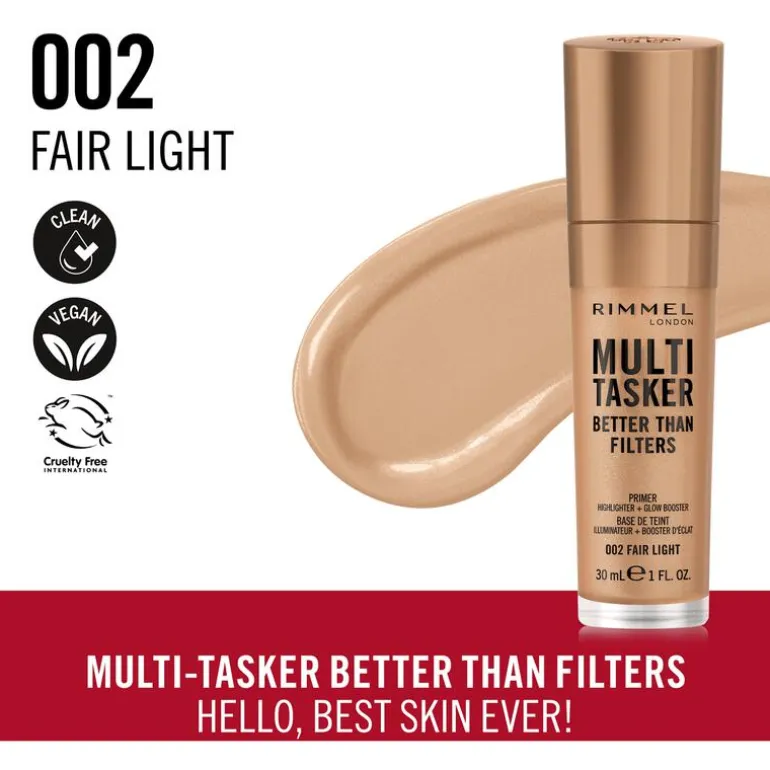HELLO BEST SKIN EVER. BETER DAN WELKE FILTER DAN OOK: EEN PRACHTIGE GLOW OP JE MOOISTE HUID OOIT. Echte glow, beter dan een filter, op je mooiste huid ooit: met de 3-in-1 huidprimer, glowbooster en highlighter Multi-Tasker Better Than Filters!• Draag jouw glow op jouw manier met de Multi-Tasker Better Than Filters gezichtsprimer, glowbooster en highlighter: kan zonder jouw basismake-up aangebracht worden, maar ook gemengd met, onder of op jouw basismake-up• De vederlichte, gemakkelijk te blenden formule is verrijkt met natuurlijke biopeptiden, vitamine C en E. Je huid voelt goed doorvoed en gerevitaliseerd aan en ziet er in slechts 4 weken beter uit.• De lichtweerkaatsende pigmenten geven de huid een perfect stralende en zachte glow: social mediafilters heb je niet meer nodig• De Multi-Tasker Better Than Filters is verkrijgbaar in 8 op de huid afgestemde tinten en is dierproefvrij en vegan