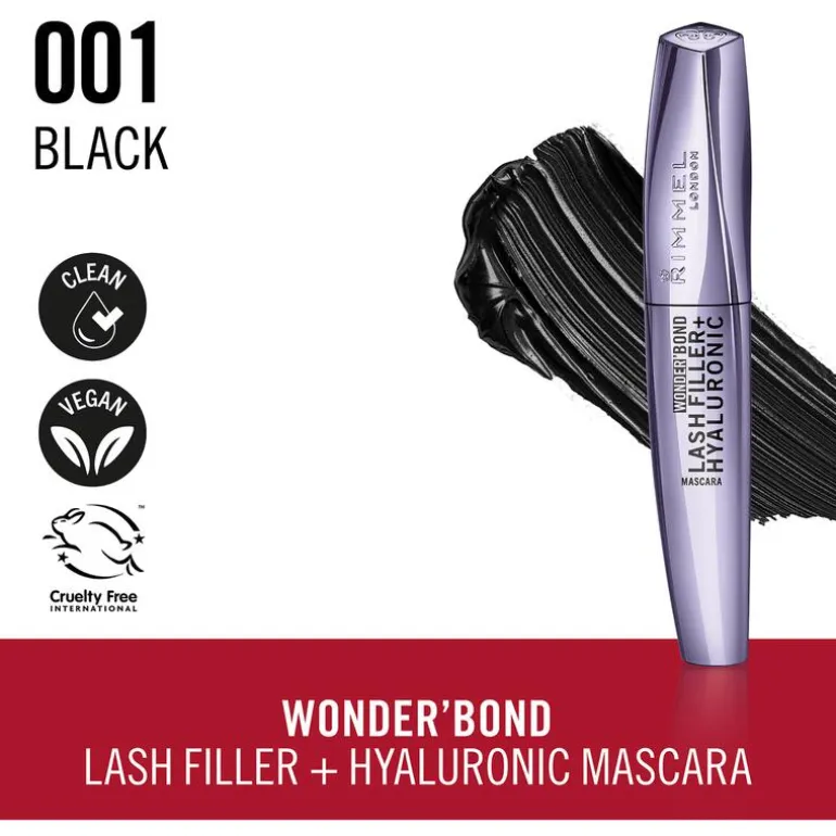 Ga voluit voor volume! De nieuwe Rimmel Wonder’Bond Lash Filler + Hyaluronic Mascara is verrijkt met een biotinebindend complex met hyaluronzuur. Voor wimpers die er 100% voller en dikker uitzien, met tot 5x meer zichtbaar volume!* Houdt vocht vast in de wimpers, zodat ze er gehydrateerd, gevoed en sterker uitzien!