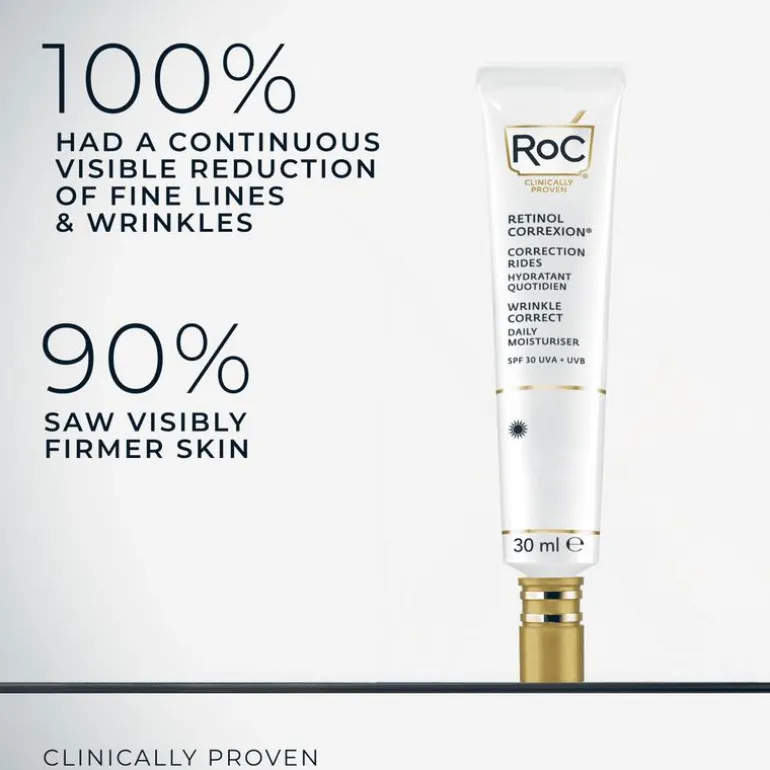 RoC® RETINOL CORREXION Wrinkle Correct Daily Moisturiser SPF 30 is een intensive anti-aging verzorging die de gehele dag door werkt om het verschijnen van lijntjes en rimpels zichtbaar te verminderen.