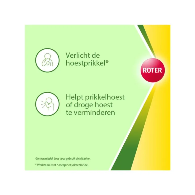 Roter Noscapect Tabletten is een geneesmiddel ter verlichting van droge hoest (). Heeft u al een tijdje last van een vervelende hoest? Komt er bij het hoesten weinig slijm vrij en voelt de hoest droog of prikkelbaar aan? Het is niet ongewoon dat droge hoest niet vanzelf verdwijnt. In dergelijke gevallen is het aan te raden om Roter Noscapect te gebruiken, met de werkzame stof noscapinehydrochloride. Dit middel helpt de hoestprikkel te verlichten, voorkomt dat uw droge hoest verergert door overmatig hoesten, en bevordert een betere nachtrust. Hoesten is een natuurlijke reactie van het lichaam wanneer de luchtwegen geïrriteerd zijn. Een ‘gewone’ hoest zorgt ervoor dat u schadelijke stoffen kwijtraakt door het ophoesten van slijm, wat de hoest kalmeert. Bij een droge hoest heeft u echter geïrriteerde luchtwegen en wordt er geen slijm opgehoest. Het overmatige hoesten kan de hoestklachten verergeren, en Roter Noscapect kan helpen door de hoestprikkel te verminderen.