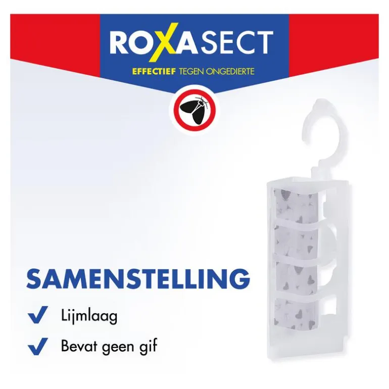 Ben jij helemaal klaar met al die motten in je kledingkasten en die gaatjes in jouw mooie kleding? Roxasect Mottenval houdt jouw kledingkast mottenvrij. De Roxasect Mottenval bestrijdt motten. De motten verschuilen zich in de val en worden vervolgens door de lijmlaag op de val vastgehouden. De Roxasect Mottenval heeft een geïntegreerde haak en kan hiermee aan kledinghangers of rekken opgehangen worden. De mottenval kan ook met de plakstrip aan de binnenzijde van de kledingkast bevestigd worden.
