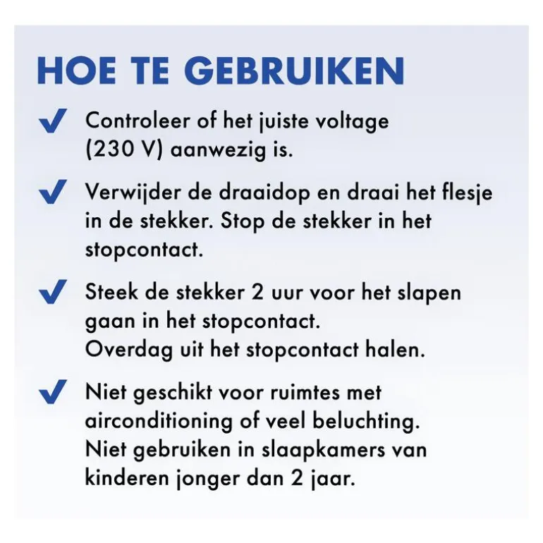 Gebruiksaanwijzing: – Controleer vooraf of het juiste voltage (230V) aanwezig is -Verwijder de draaidop van het flesje en draai het flesje in zijn geheel in de stekker totdat het flesje vast zit – Plaats de stekker in het stopcontact – De stekker kan, indien gewenst, 90 graden gedraaid worden. De rode schakelaar dient zich echter altijd aan de bovenkant te bevinden – De stekker moet met de schakelaar aan-en uitgezet worden. De aanbeveling is om 2 uur voor het slapen gaan de stekker al aan te zetten. Overdag de stekker uitzetten – De stekker niet met natte handen of metalen voorwerpen aanraken en niet bedekken met een natte doek of ander materiaal – De stekker werkt in een ruimte van ongeveer 30m3 – Niet gebruiken in slaapkamers van kinderen jonger dan 2 jaar. Samenstelling: Prallethrin (6,7 g/L (0,87% ww). Inhoud: 1x flesje 360 uur / 30 m2. De Roxasect Anti-Mug stekker is ook verkrijgbaar in: – Startverpakking: 1 stekker en 1 flesje 360 uur/30m2 – Navulverpakking;1 flesje 360 uur/ 30 m2