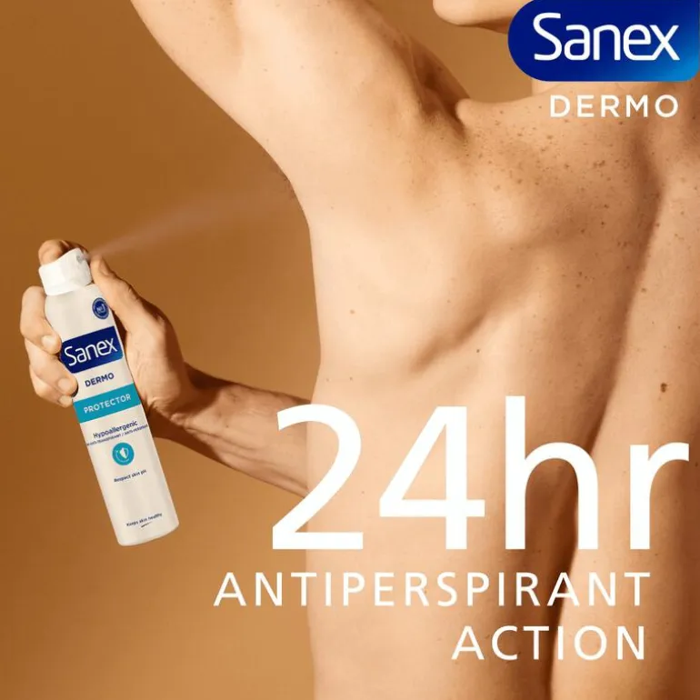 Verzorg je tere okselhuid en krijg tegelijkertijd een goede bescherming voor belangrijke dagen met Sanex Dermo Protector anti transpirant spray. Deze anti transpirant spray is speciaal samengesteld om je tot 24 uur lang effectief te beschermen tegen zweet en geurtjes, zodat je aan je drukke dag kunt beginnen met één zorg minder. En omdat het hypoallergeen is, geeft deze deodorant spray je een comfortabel gevoel. Niet alleen beschermt deze anti transpirant spray je optimaal tegen zweet en geurtjes, het verzorgt ook je okselhuid. De anti transpirant spray is dermatologisch getest en speciaal ontwikkeld om de natuurlijke pH-waarde van de huid te herstellen. Houd je okselhuid optimaal verzorgd en gezond met Sanex.
