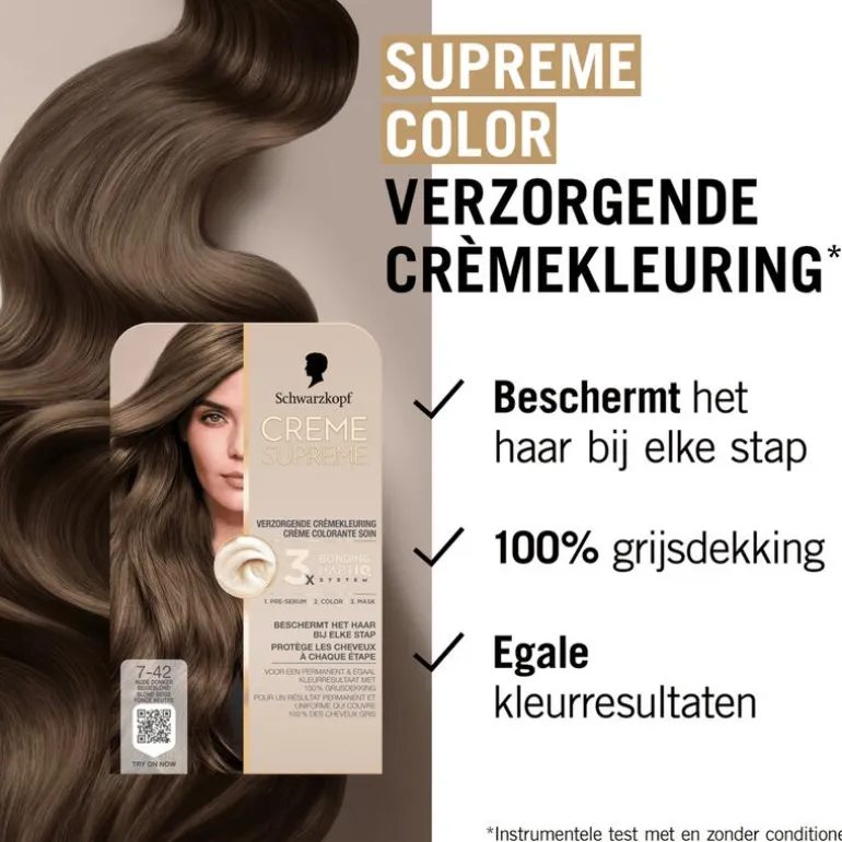 Meer dan 120 jaar geleden legde de Duitse chemicus en apotheker Hans Schwarzkopf de basis voor een merk dat sindsdien altijd voorop heeft gelopen op het gebied van innovatie. De combinatie van kwaliteitsingrediënten en de nieuwste haarverzorgingstechnologie, betrouwbaarheid, expertise en vakmanschap zijn de hoekstenen van alles wat het merk doet en waar het voor staat. Creme Supreme is de meest verzorgende permanente haarkleuring van Schwarzkopf, met het 3x Bonding HAPTIQ System dat het haar beschermt bij elke stap : voor, tijdens en na het kleuren.