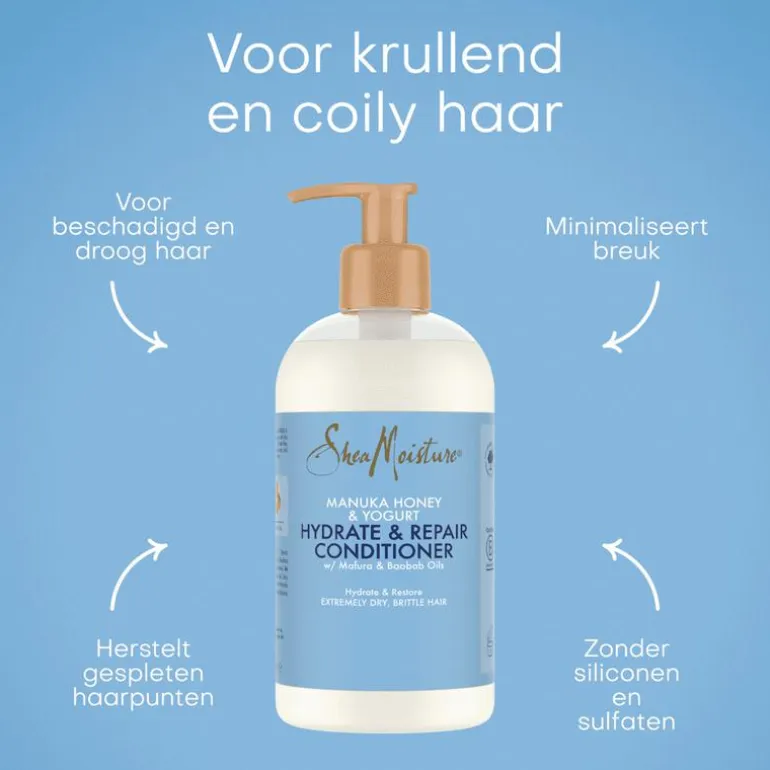 SheaMoisture Manuka Honey & Yoghurt Hydrate & Repair Conditioner herstelt droog en beschadigd haar. De conditioner helpt beschadigd haar en gespleten haarpunten te herstellen, waardoor je haar weer gezonder aanvoelt. De herstellende conditioner vermindert haarbreuk op warmte-gestyled haar met 76% wanneer gebruikt met onze Hydrate & Repair Shampoo*. Wanneer je deze conditioner regelmatig gebruikt, wordt je haar veerkrachtiger, sterker en gaat het weer glanzen. De SheaMoisture Manuka Honey & Yoghurt Hydrate & Repair Conditioner is verrijkt met een voedende mix van manukahoning, yoghurt, natuurlijke sheaboter en mafura- en baobabolie. Dit product is geschikt voor dagelijks gebruik, bevat geen siliconen en sulfaten en is ook geschikt voor gekleurd haar. *Getest op niet-chemisch behandeld haar.