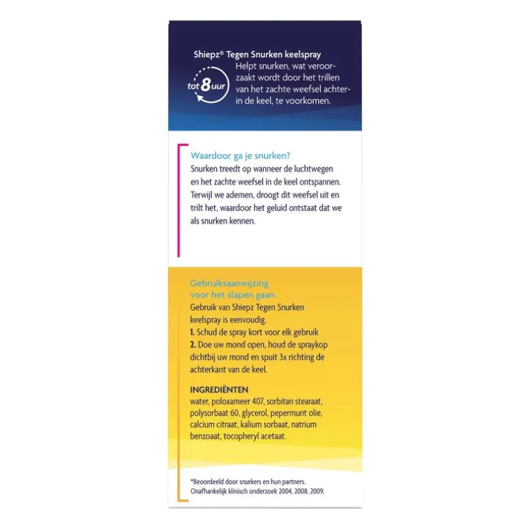 Shiepz Tegen Snurken keelspray helpt snurken, wat veroorzaakt wordt door het trillen van het zachte weefsel achterin de keel, te voorkomen. Snurken treedt op wanneer de luchtwegen en het zachte weefsel in de keel ontspannen. Terwijl we ademen, droogt dit weefsel uit en trilt het, waardoor het geluid ontstaat dat we als snurken kennen. De keelspray met de thermo-gelformule met micro-bolletjes wordt dikker als reactie op de natuurlijke lichaamswarmte. Dit zorgt ervoor dat de belangrijkste ingrediënten blijven waar ze het meest effectief zijn, waardoor de keel tot 8 uur lang wordt verzacht en gesmeerd.