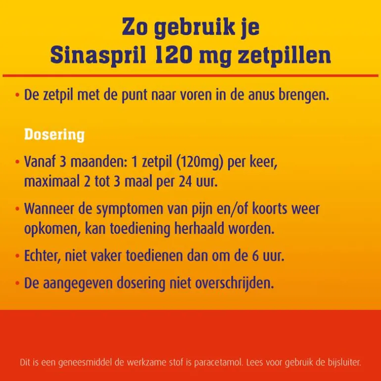 met puntzijde voorop anaal inbrengen, bevochtigen zetpil bevordert inglijden, 6 uur tussenpozen aanhouden. Dosering en maximale dagdosering is niet alleen afhankelijk van leeftijd, maar ook van lichaamsgewicht. Zie bijsluiter voor het juiste doseeradvies. Bij geen verbetering van de klacht niet langer gebruiken dan 5 dagen bij pijn en bij koorts niet langer dan 3 dagen, zonder overleg met arts.