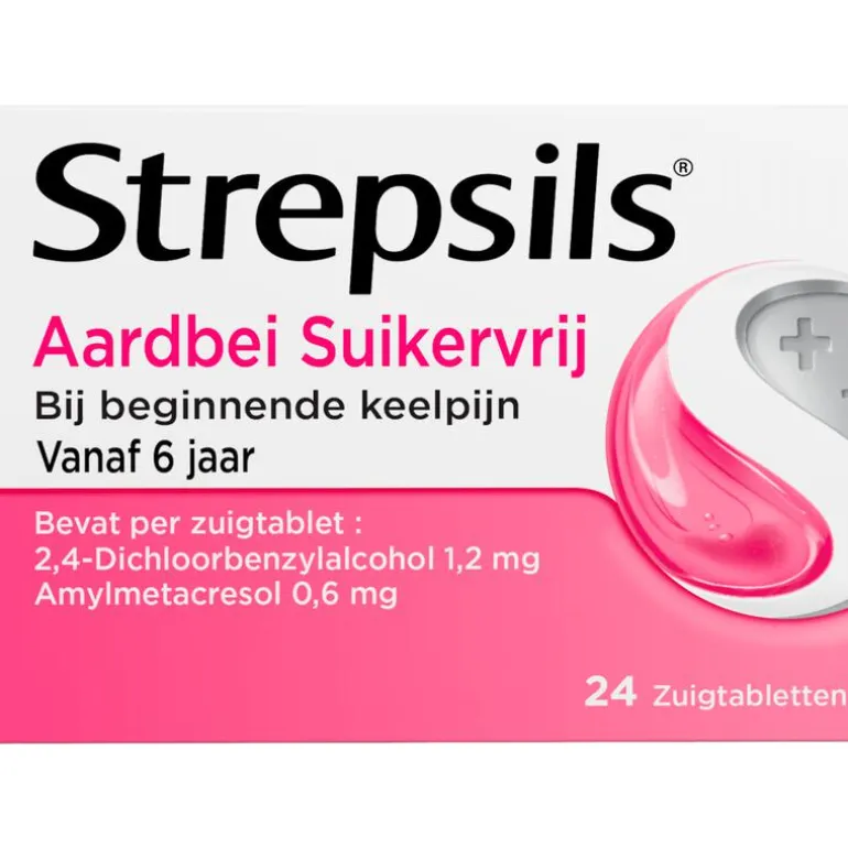 Strepsils Zuigtabletten Aardbei Suikervrij helpt bij beginnende keelpijn. Strepsils is een geneesmiddel met antibacteriële ingrediënten waarvan klinisch is bewezen dat ze de bacteriën doden die keelpijn veroorzaken. De tabletten met de bekende, originele formule met de smaak van aardbei verzachten de keel onmiddelijk. De Strepsils Zuigtabletten werken nog lang nadat het zuigtablet op is en zijn suikervrij. Lees vóór gebruik de bijsluiter.