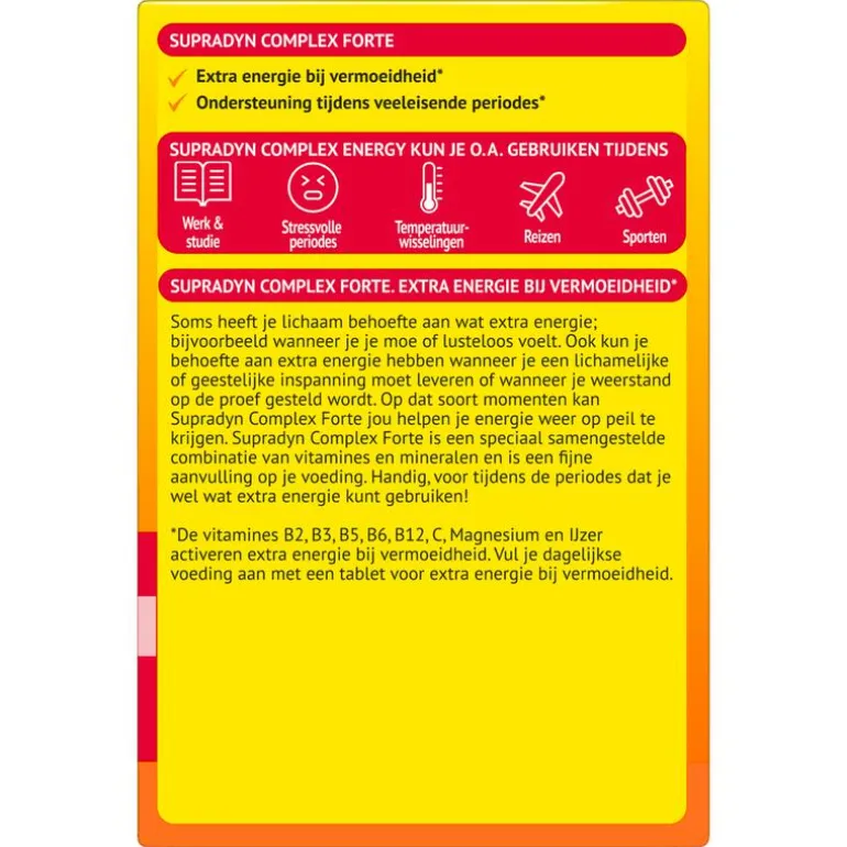 Sta actief in het leven! Supradyn Complex Forte geeft je als aanvulling op de voeding een steuntje in de rug tijdens veeleisende periodes waarin je de extra energie bij vermoeidheid goed kunt gebruiken**, zoals drukte op je werk, als je weerstand op de proef wordt gesteld, de combinatie werk/gezin. Neem als aanvulling op je dagelijkse voeding een hoog gedoseerde tablet van Supradyn Complex Forte. ; *De vitamines B2, B3, B5, B6, B12, C, het mineraal magnesium en het sporenelement ijzer activeren extra energie bij vermoeidheid. ; **Multiscope marktpeiler 2016 ; ***Vergeleken met Supradyn Complex Energy; ruim onder de maximaal veilige hoeveelheid.