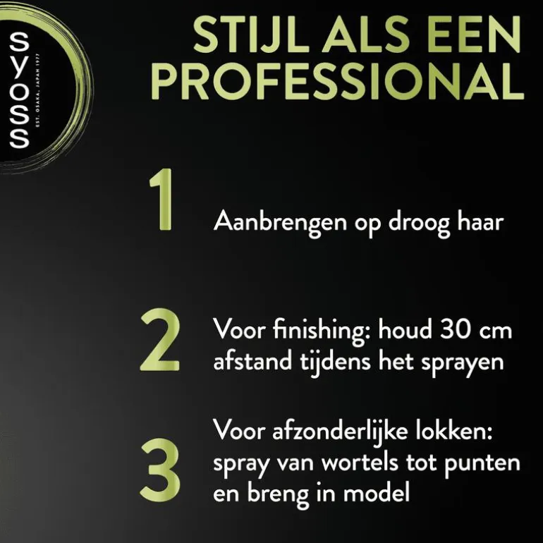 Aanbrengen op droog haar. Voor afwerking: op 30cm afstand sprayen. Voor extra volume: buig je hoofd voorover en spray in losgeschud haar. Als de spray verstopt is, dan de spraykop met warm water afspoelen. Gebruik voor optimale stylingresultaten ook Syoss mousses, gels of waxen.