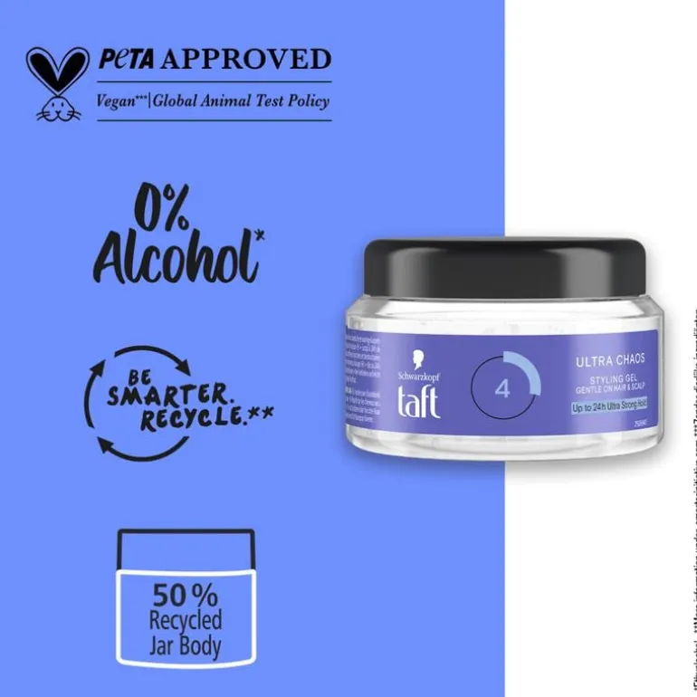 Taft Ultra Chaos Styling Gel voor chaotische en warrige kapsels. Het geeft je haar tot 24 uur ultra sterke hold, plakt niet en is makkelijk uit te wassen. Deze gel is zacht voor haar en hoofdhuid en bevat hydraterende panthenol. De gel is vrij van alcohol (ethylalcohol). Alle Taft formules zijn vegan* en PETA gecertificeerd**.