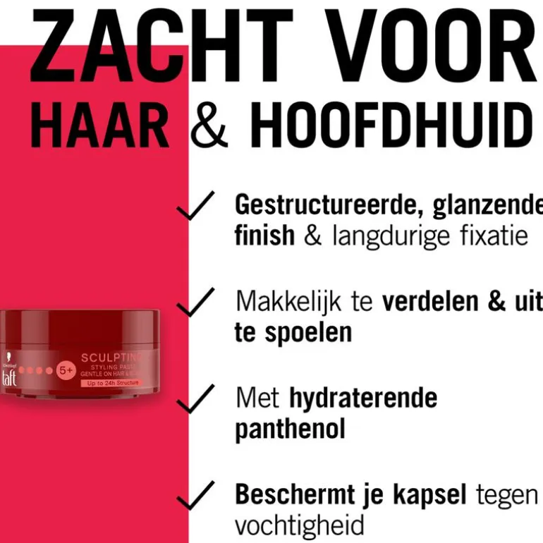 Creëer met Taft specialties flexibele kapsels voor een natuurlijk resultaat dat de hele dag in model blijft. Kies de textuur die bij je past, om je look naar wens te hervormen. Wil je er verzekerd van zijn dat je haar de hele dag in model blijft? De Taft Sculpting paste is de oplossing! Een fijne pasta die je haar een mooie glanzende finish geeft en gemakkelijk is aan te brengen. Het voordeel van het gebruik van een paste is dat het je haar zacht en soepel houdt en je daardoor gemakkelijk gedurende de dag je haar kunt re-stylen. Ook is het geschikt voor wat langer haar.