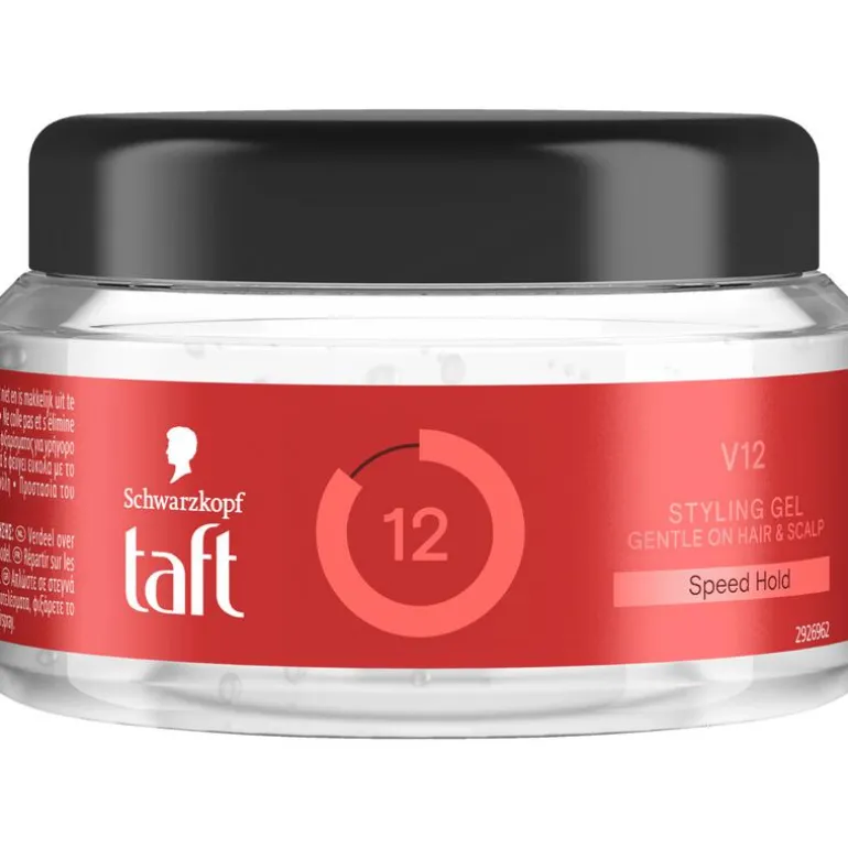 Taft V12 Styling Gel met speed-hold technologie plakt niet en is gemakkelijk uit te wassen. Deze gel is zacht voor haar en hoofdhuid en bevat hydraterende panthenol. Het helpt het haar te beschermen tegen vochtigheid en wind. Alle Taft formules zijn vegan* en PETA gecertificeerd**.