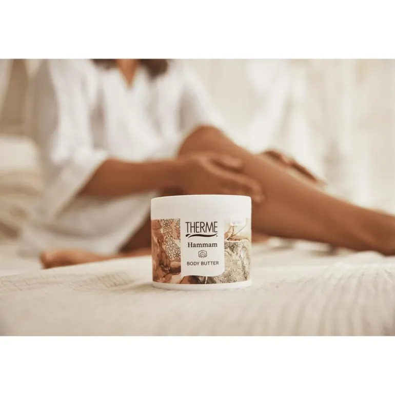 Ontspan lichaam en geest en prikkel je zintuigen met deze luxe wellness beleving. Therme Hammam Body Butter to Oil is een rijk voedende crème met organic argan- en olijfolie die de huid intensief hydrateert. Na even inmasseren verandert de crème in een voedende lichaamsolie. Het laat een verzorgend laagje achter en parfumeert het lichaam langdurig. Geniet van de oriëntaalse geur van cederhout gecombineerd met warme oosterse kruiden en aromatische bergamot.
