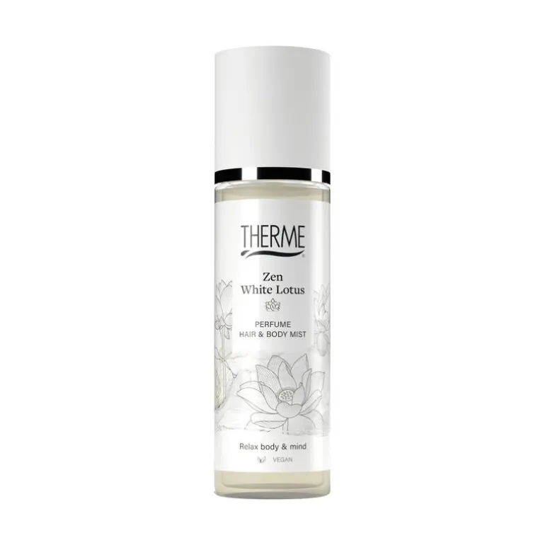 Creëer een feel-good moment en prikkel je zintuigen met deze luxe wellness beleving.THERME Zen White Lotus Perfume Hair & Body Mist is een parfumerende spray voor haar en lichaam.De mist heeft een verfrissende en hydraterende werking. Geniet van de serene geur van witte lotus gecombineerd met aromatische jasmijn en subtiele witte musk.