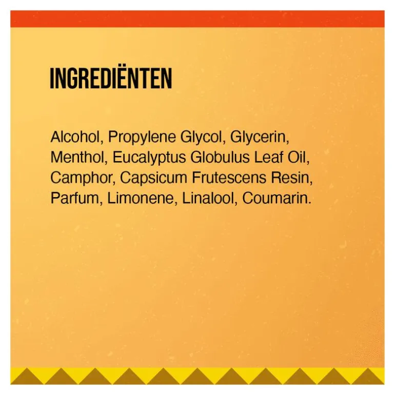 Alcohol, Propylene Glycol, Glycerin, Menthol, Eucalyptus Globulus Leaf Oil, Camphor, Capsicum Frutescens Resin, Parfum, Limonene, Linalool, Coumarin.