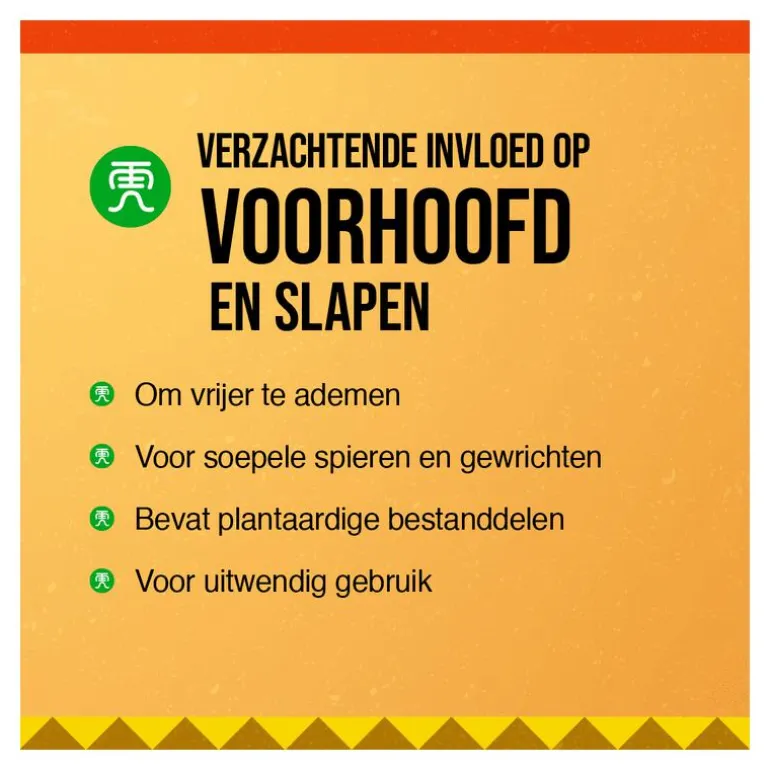 • Verzachtende invloed op voorhoofd en slapen. • Om vrijer te ademen. • Voor spieren en gewrichten.
