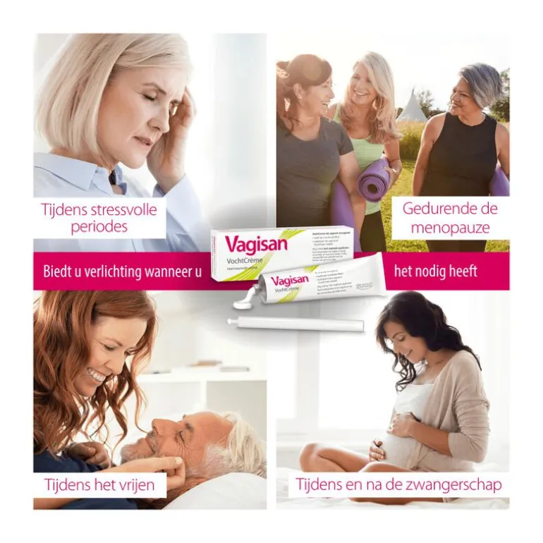 Tijdens de menopauze of overgang neemt de activiteit van de eierstokken af en produceert het lichaam minder van het vrouwelijke hormoon oestrogeen. De wanden van de vagina en slijmvliezen van de uitwendige zone kunnen hierdoor dunner en droger worden. Deze droogheid trekkerig aanvoelen. Symptomen van vaginale droogheid zijn bijvoorbeeld steken, jeuk, kleine wondjes en pijn tijdens geslachtsgemeenschap. Andere oorzaken van vaginale droogheid kunnen zijn: anti-oestrogeen behandeling, anticonceptie pil, medicijn gebruik, chemotherapie, radiotherapie, zwangerschap en borstvoeding.Vagisan VochtCrème biedt een oplossing tegen vaginale droogheid en daar dragen twee effecten voornamelijk aan bij:• de crème heeft een hoog watergehalte en hydrateert hierdoor de huid in de vagina en de uitwendige genitale zone• voedende lipiden (vetten) houden de huid soepel. Vagisan Vochtcrème is hormoonvrij en met de toevoeging van melkzuur heeft de crème een pH van 4,5. Hierdoor helpt Vagisan VochtCrème een natuurlijke pH in de vagina te bewaren. Vagisan VochtCrème is bestemd voor toepassing in de vagina en op de uitwendige intieme zone en kan worden aangebracht met of zonder een applicator