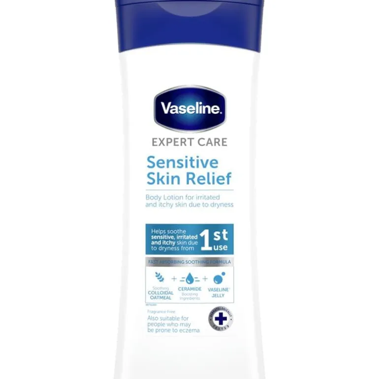Vaseline Expert Care Sensitive Skin Relief Bodylotion hydrateert onmiddelijk om de gevoelige, geïrriteerde en/of jeukerige huid als gevolg van droogheid te helpen verzachten.