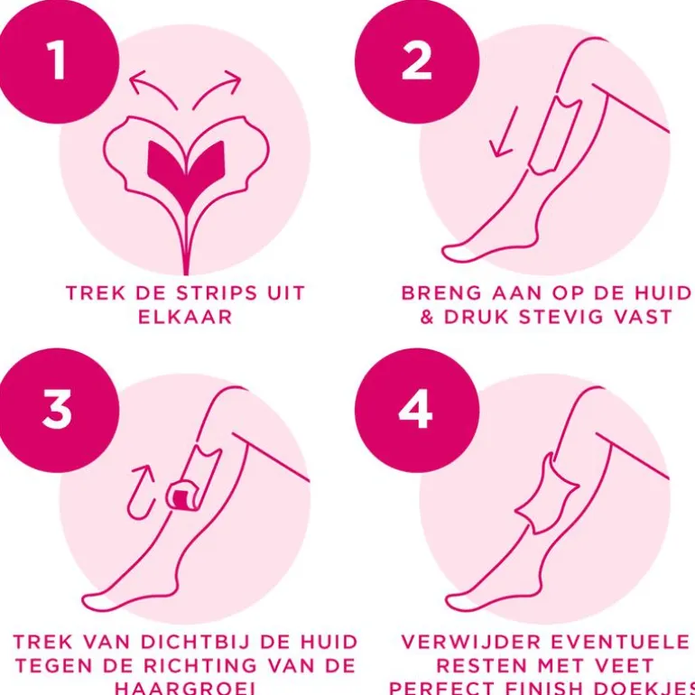 Lees voor gebruik van Veet-waxstrips zorgvuldig de voorzorgsmaatregelen op de verpakking.Zorg ervoor dat de huid voor de waxbeurt schoon en droog is. U kunt de waxstrips meer dan één keer per ontharingssessie hergebruiken tot deze niet meer kleeft. Niet meer nodig om de strips tegen elkaar te wrijven om ze uit elkaar te halen! Je krijgt een perfect resultaat in slechts 4 eenvoudige stappen:1 Trek de strips voorzichtig van elkaar met behulp van de ronde lipjes.2 Breng één strip aan op je huid in de groeirichting van de haartjes. Wrijf een paar keer in de groeirichting van de haartjes om te zorgen dat de wax goed blijft plakken.3 Houd je huid goed strak. Pak het lipje vast en trek de strip zo snel je kunt weg, tegen de haargroeirichting in. Trek de strip in één snelle beweging weg, parallel aan de huid, dus niet van de huid weg.4 Verwijder na het ontharen de wax restjes van je huid met een nabehandelingsdoekje.Niet in het toilet gooien.